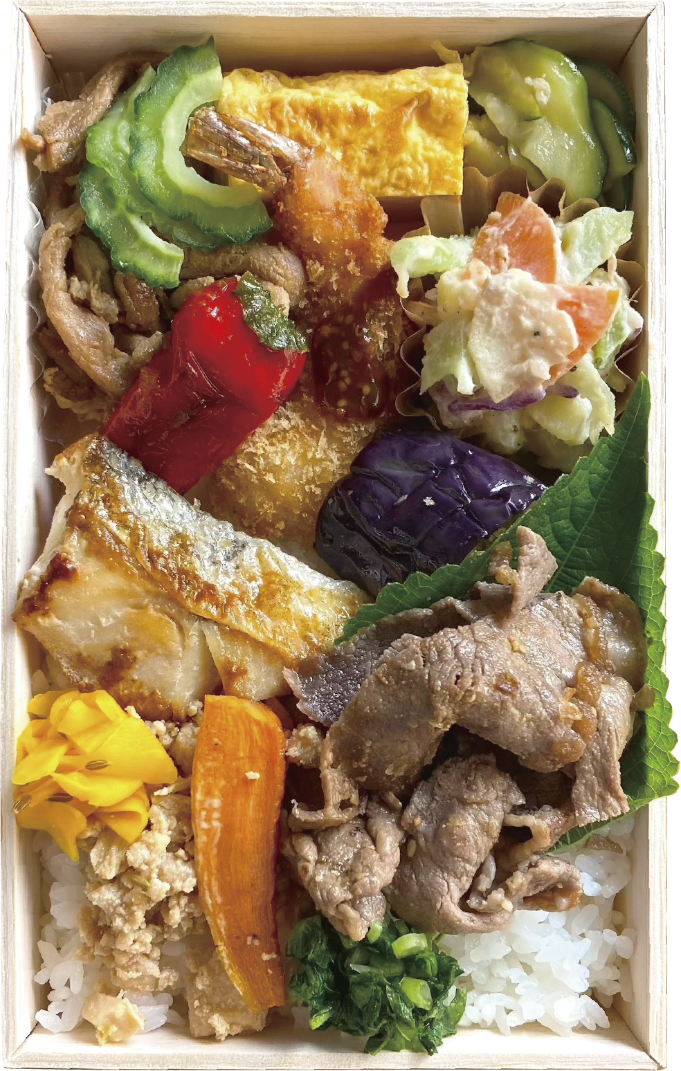 季節野菜も取り入れたお弁当 / 魚と肉 / 焼き物 / 酢の物 / 魚 / 揚げ物 / 添え野菜 / 出汁巻き玉子焼き / 炒め物など